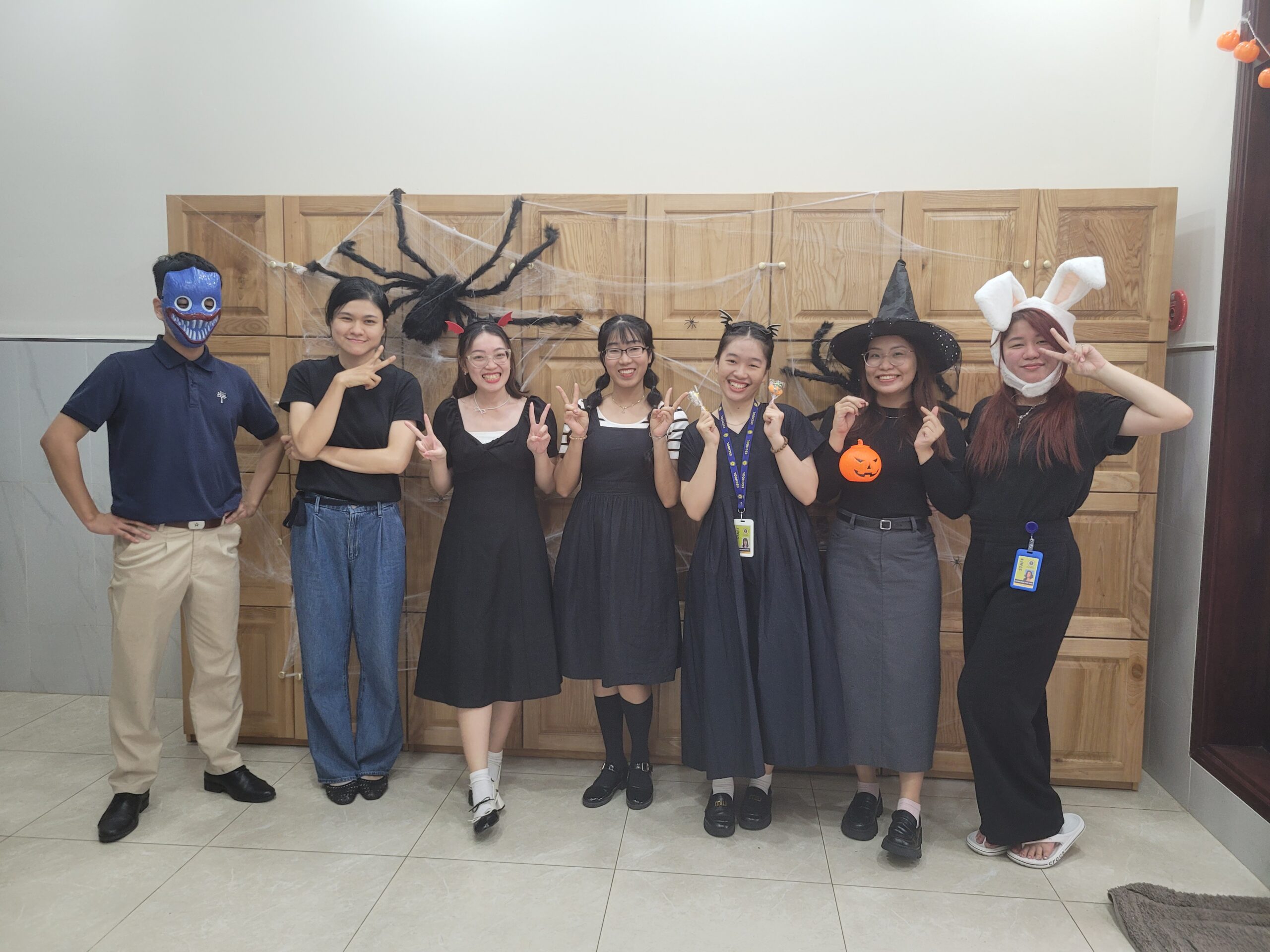 Các bạn học sinh và thầy cô đã hòa mình vào ngày hội với những bộ trang phục đầy ấn tượng, từ phù thủy, ma cà rồng, đến siêu anh hùng và các nhân vật hoạt hình nổi tiếng. Sự sáng tạo của mọi người đã mang đến màu sắc đa dạng, khiến không gian trở nên sống động và đậm chất Halloween. Với những ai chưa có ý tưởng hóa trang, các bộ đồ đen tối giản cũng là lựa chọn thú vị để hòa nhập vào không khí lễ hội.